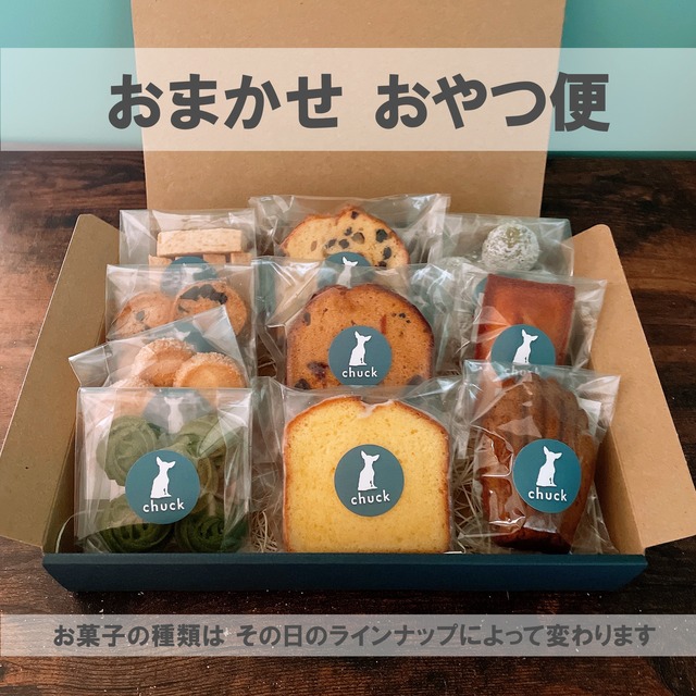 「焼き菓子屋 chuck」のお菓子がいろいろ入った「おやつ便」です。 はじめての方や、いろいろなお菓子を楽しみたい方におすすめ! 手提げ袋はつきません。 3箱以上発送する場合、送料が安くなることがございます。ご希望の方は、ご購入の前にご相談下さい。 …………………………………………… ●●お届けするお菓子 【 10点】●● ・パウンドケーキ 3個 ・フィナンシェ/マドレーヌ 2個 ・クッキー 5袋 …………………………………………… 《 お菓子の種類について 》 ・パウンドケーキ ...レモンケーキ、いちじくのケーキ、コーヒーキャラメルケーキなど ・フィナンシェ ...プレーン、抹茶、メープルなど ・マドレーヌ ...バニラ、ほうじ茶など ・クッキー ...発酵バター、チョコナッツ、くるみ、ショートブレッドなど ※レモンケーキの販売期間は、12月~5月中旬頃です。 ※基本的に内容はおまかせになりますが、ご希望がある場合はお問い合わせ下さい。 《 賞味期限について 》 ・パウンドケーキ、フィナンシェ、マドレーヌ …発送日から6~10日間 ・クッキー …発送日から2~3週間 《 発送について 》 通常、ご注文から1週間以内にヤマト運輸の「コンパクト便」で発送いたします。 着日等ご希望がある場合は、ご予約前にメッセージでご相談下さい。 《 その他の注意事項 》 ・店頭で販売しているラインナップにより、お届けするお菓子が変わります。また、種類ごとの数は前後する事がございます。 ・長期不在や住所間違いによりお受け取りいただけず返送となった場合、送料を着払いで再発送させていただきます。その場合、賞味期限までの日数が短くなりますが、新たにお菓子を作りなおすことはできかねます。 ・梱包には十分気を付けておりますが、配送の際クッキーが割れてしまうことがあります。大幅な破損でない限り、返品・交換はいたしかねます。 ・恐れ入りますが、お客様ご都合での発送後のキャンセルや返品はご遠慮いただけますようお願いいたします。